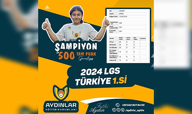 Şanlıurfa'nın Eğitimde öncü kurumlarından Aydınlar Eğitim Kurumlarının öğrencisi İlknur Erinç Liselere Geçiş Sistemi (LGS) sınavında 500 tam puan alarak Türkiye birincisi oldu.2012'den yılından beri "Tek işimiz eğitim" felsefesiyle Şanlıurfa'ya ve Şanlıurfalılara eğitim alanında hizmet veren Aydınlar Eğitim Kurumları 2024 LGS başarısı ile taçlandırdı.Şanlıurfa'nın eğitimde parlayan yıldızı Aydınlar Eğitim Kurumlarının öğrencisi İlknur Erinç LGS de tüm soruları doğru cevaplayarak Türkiye 1’inciliği elde etti.