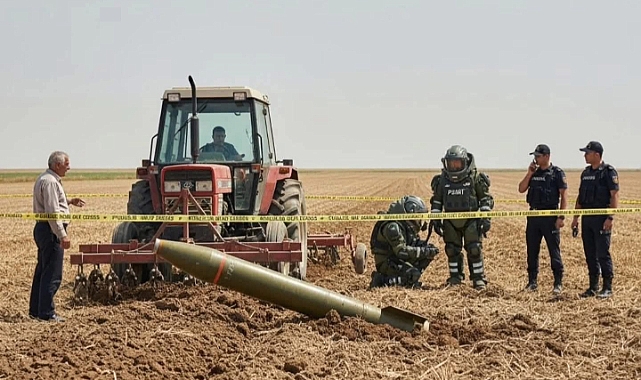 Şanlıurfa’nın Siverek ilçesinde bir çiftçi, tarlasını sürdüğü sırada traktör pulluğuna takılan patlamamış bir top mermisi buldu.Edinilen bilgilere göre, kırsal bir mahallede tarlasını süren çiftçi, pulluğa takılan metal bir cisim fark etti. Cismi incelediğinde bunun 155 milimetrelik bir top mermisi olduğunu anlayan çiftçi, durumu hemen jandarmaya bildirdi.İhbar üzerine bölgeye sevk edilen jandarma ekipleri, çevrede güvenlik önlemi alarak alanı giriş çıkışlara kapattı. Olay yerine çağrılan bomba imha uzmanları, mühimmatın incelenmesi ve güvenli bir şekilde imha edilmesi için çalışma başlattı.Olayla ilgili soruşturma devam ediyor.