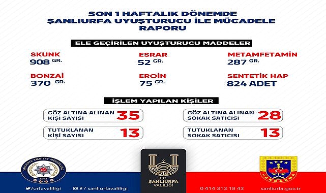 Şanlıurfa – Şanlıurfa Valisi Hasan Şıldak, kentte uyuşturucuyla mücadele kapsamında son bir haftada yürütülen operasyonlara dair çarpıcı verileri kamuoyuyla paylaştı. Emniyet ve jandarma ekiplerinin koordineli çalışmaları sonucunda uyuşturucuya karşı kararlı bir duruş sergilendi.