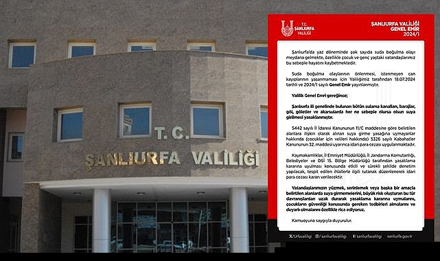 Şanlıurfa Valiliği, artan boğulma vakalarına karşı 2024/1 sayılı Genel Emir ile tüm sulama kanalı, baraj, göl, gölet ve akarsulara girişi yasakladı. Kurallara uymayanlara idari ceza uygulanacaktır.